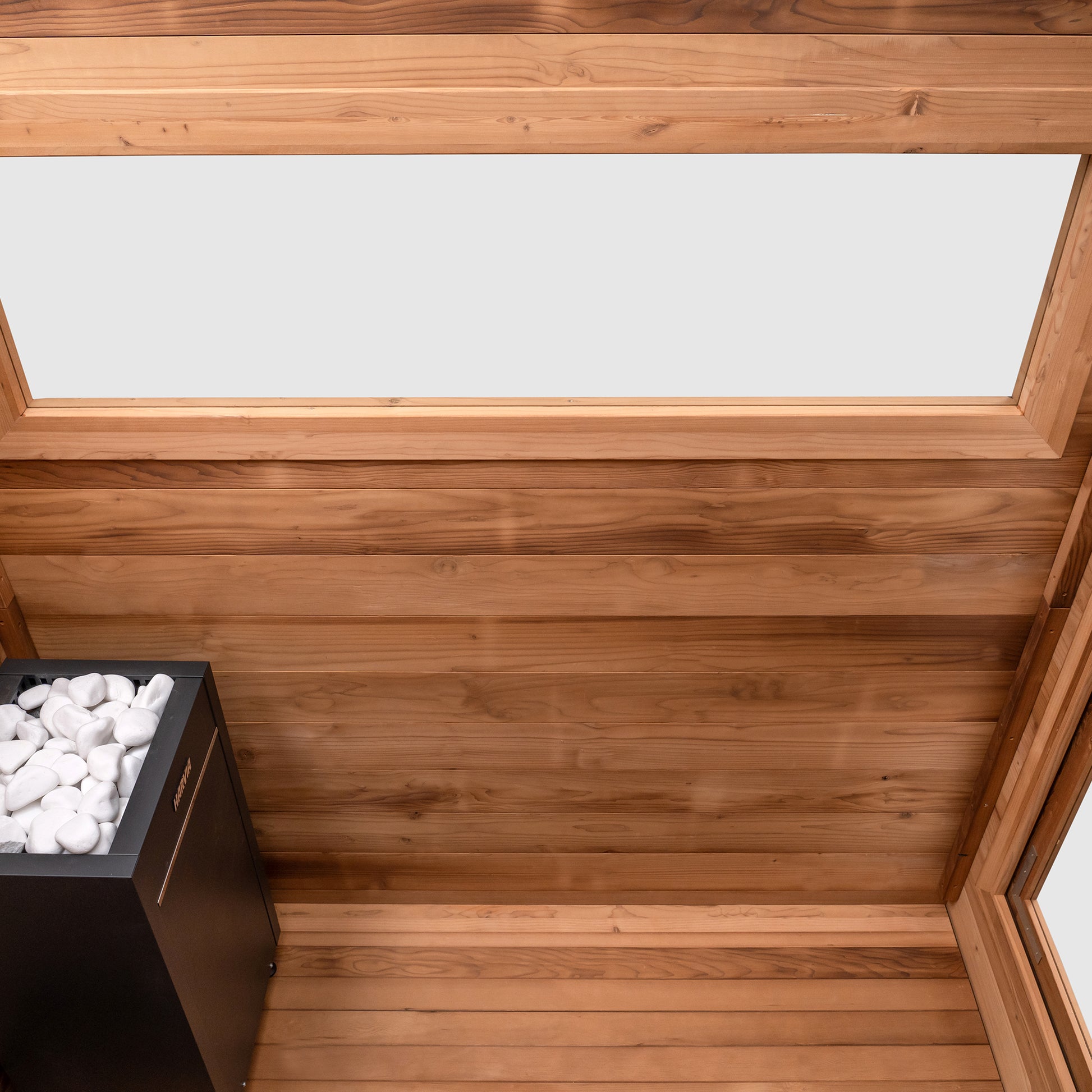Compact yet comfortable, The Cove Sauna is thoughtfully designed to bring full-body relaxation to both small and spacious settings. Its long, elevated bench positions bathers closer to the warmth while offering enough room to stretch out and unwind completely.