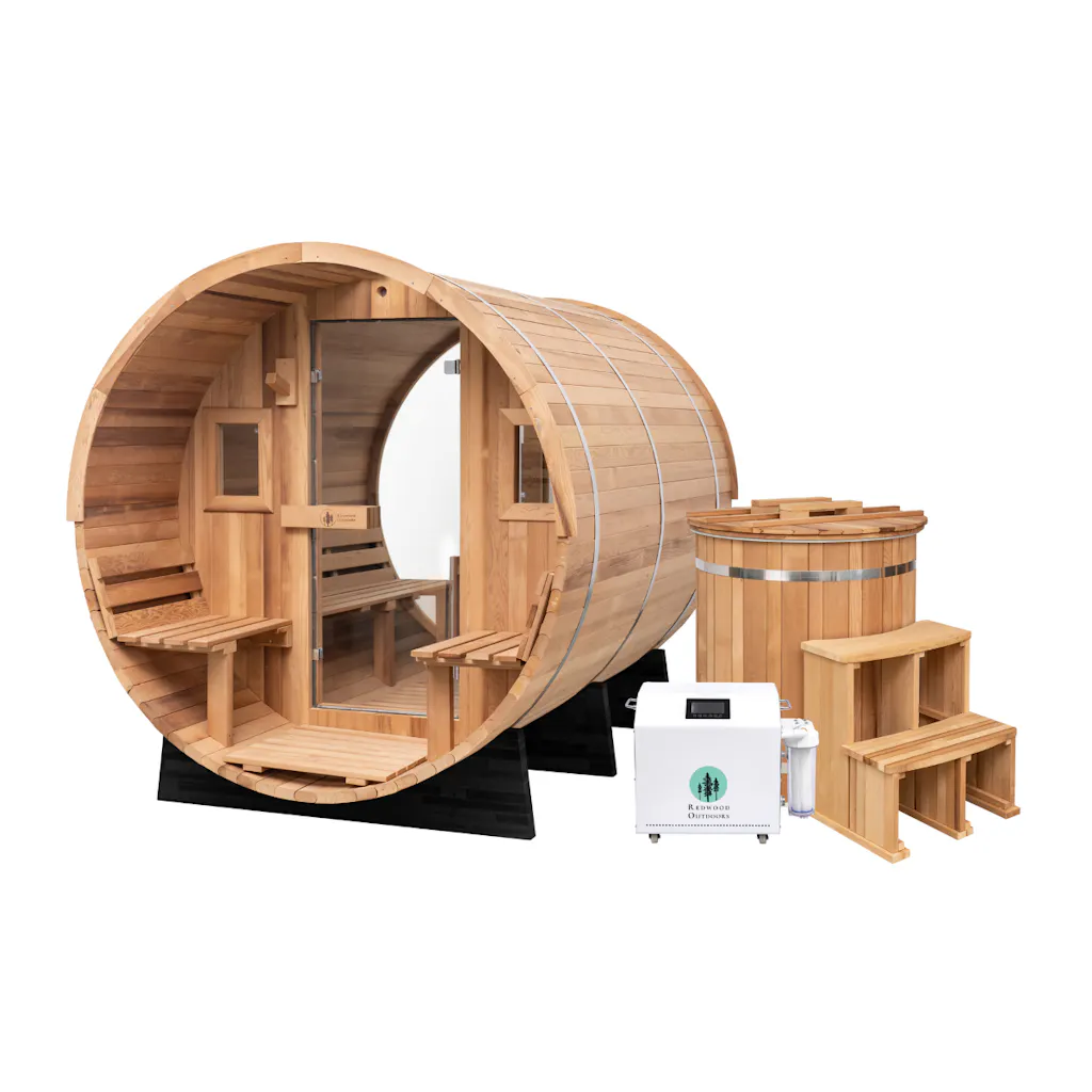 A bundle built to take your breath away. Start each sauna session in the Horizon Outdoor Sauna with a stunning full glass back wall that frames your surroundings, inviting in spectacular views. Then climb the nonslip steps into the Alaskan All-In-One cold plunge barrel and take a refreshing dip in the icy water. Afterward sit back on the spacious front porch of the sauna and unwind after a satisfying contrast therapy routine.​